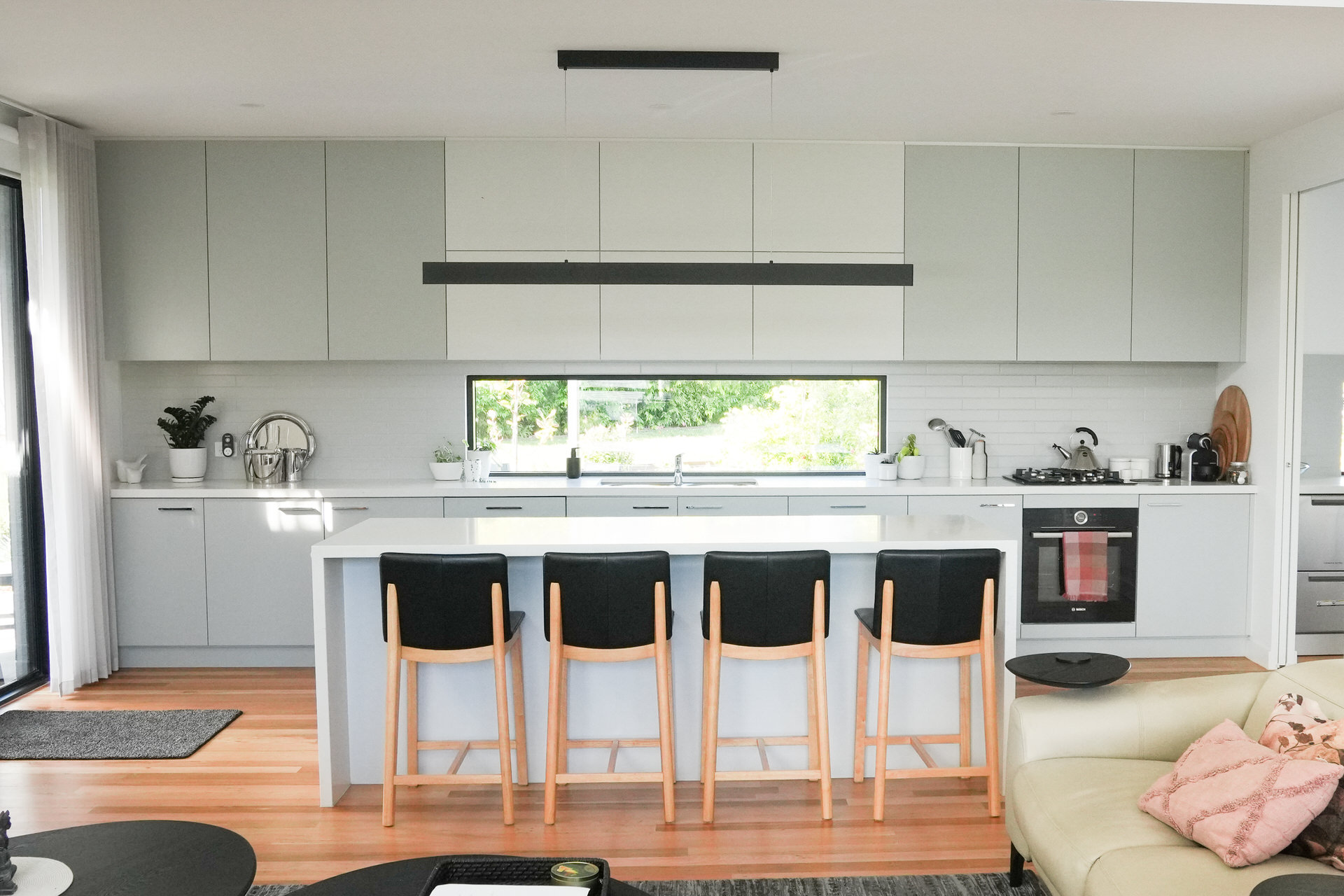 By locating their open plan living and master bedroom up one end and the remaining bedrooms down the other (behind sliding doors that disappear into the wall when open), they’re able to close off the parts of the house they don’t currently need.