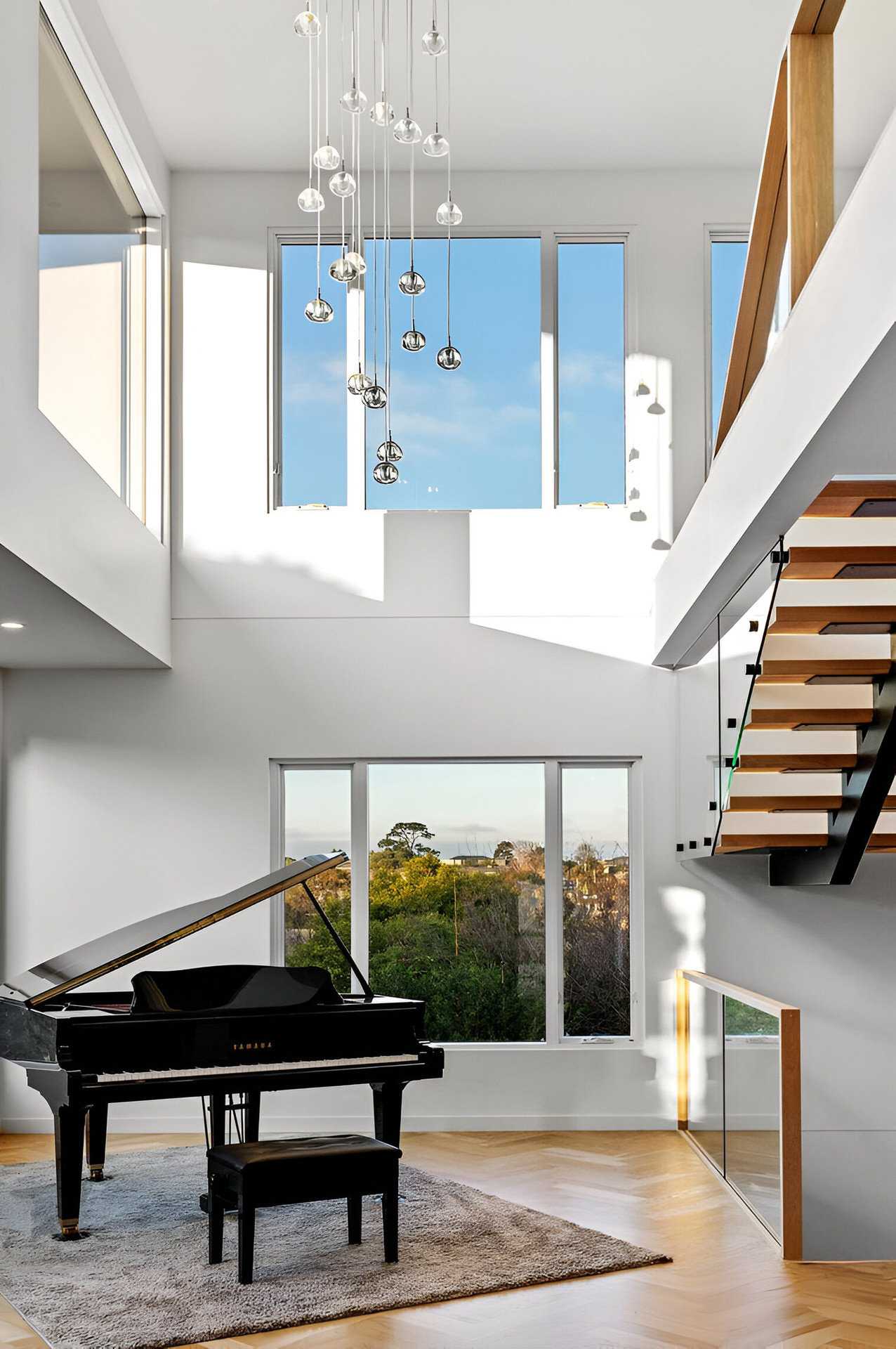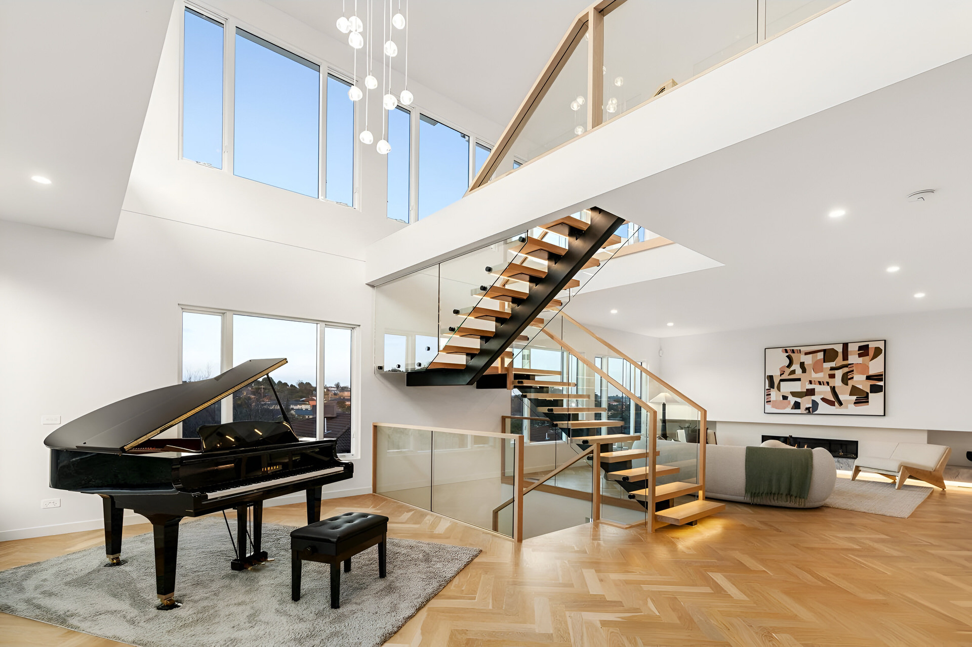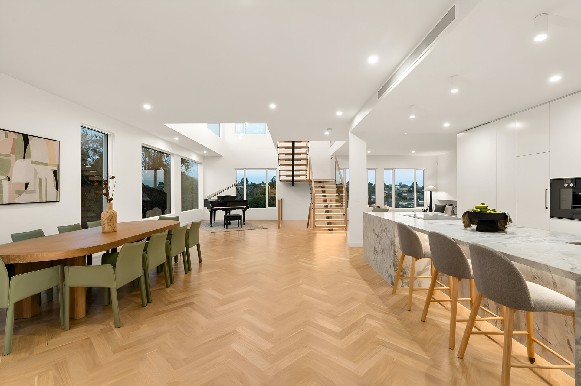 One of our favourite features is the grand staircase, which combines American Oak hardwood with a steel stringer. It accompanies an impressive void that really connects the upstairs and the downstairs.